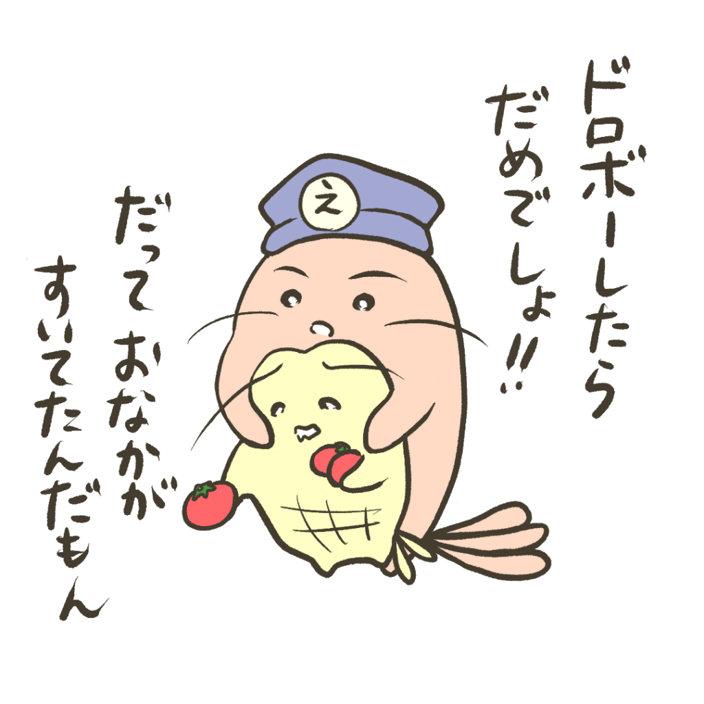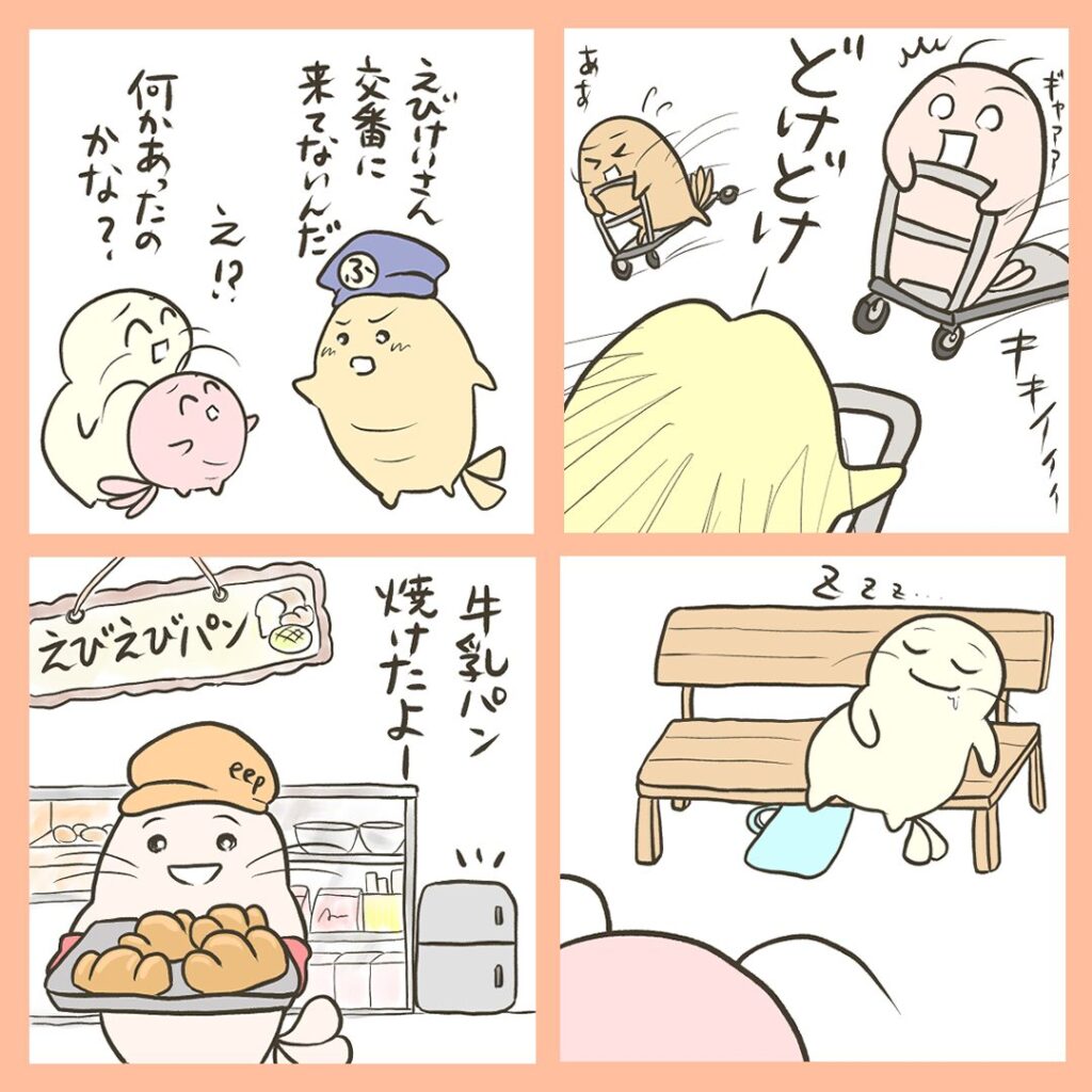 えび町を守るえびけいさつ。正義感が強く心やさしい警察官。食べることと寝ることが好き。